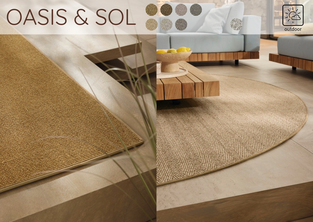 アウトドア対応の新アイテムから、ナチュラルな表情のOASISとヘリンボーン柄のSOLです。サイザルのようなテクスチャーですが、素足でもチクチクしない気持ちの良い質感が特徴です。